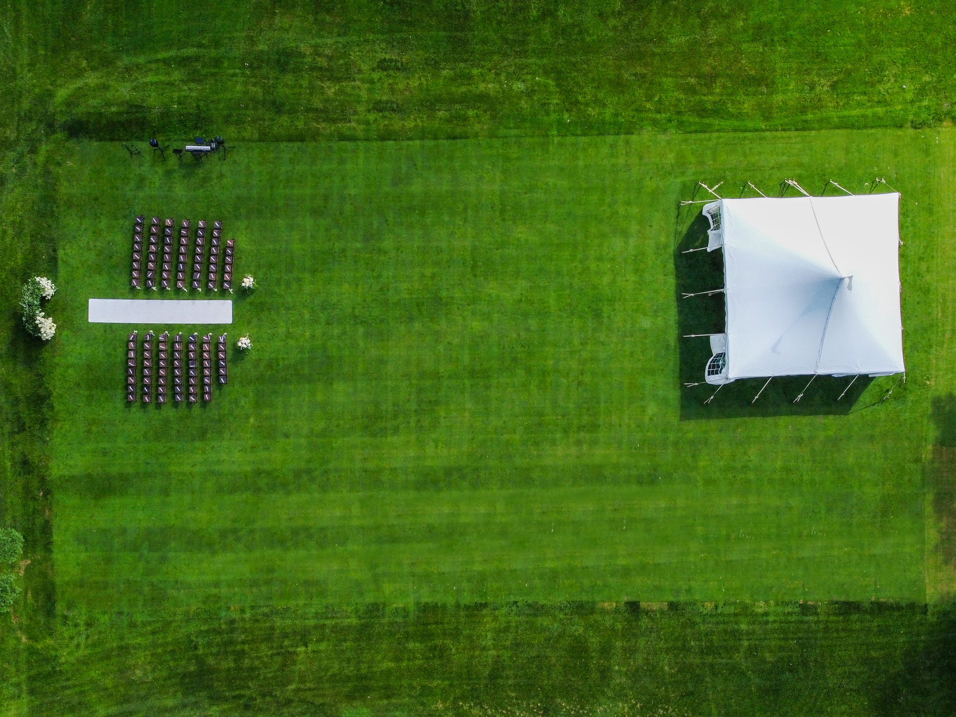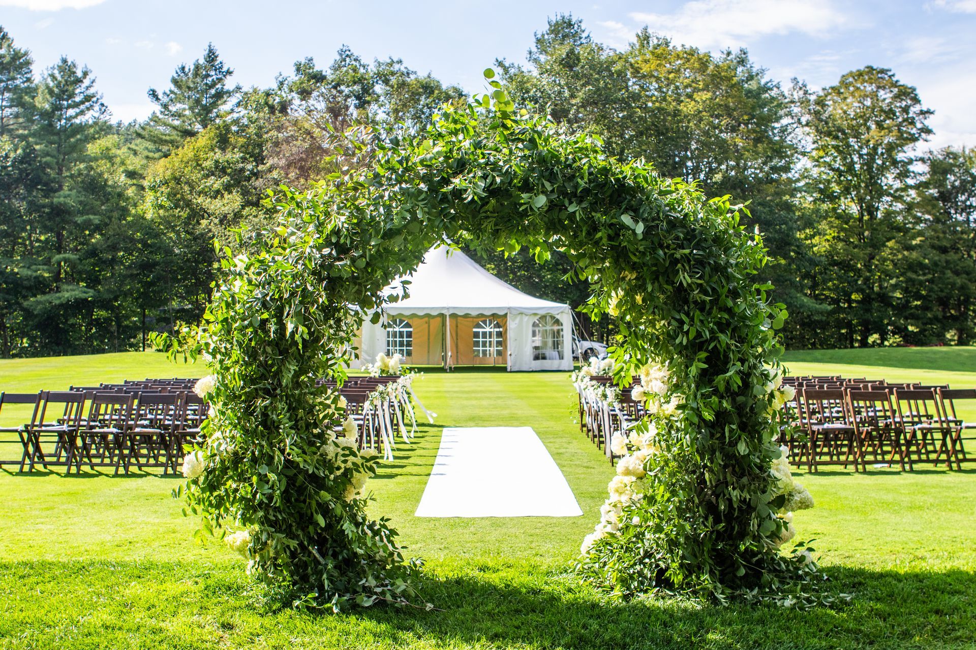 White tent set up on green grass for an event, surrounded by trees and flower decorations.