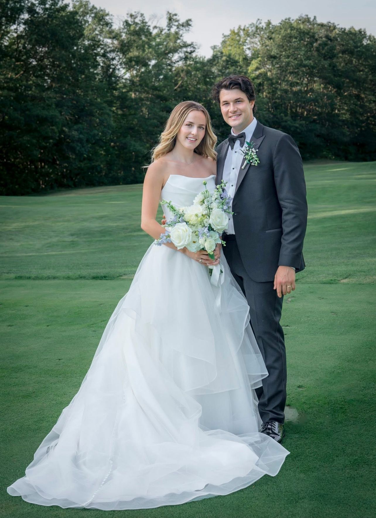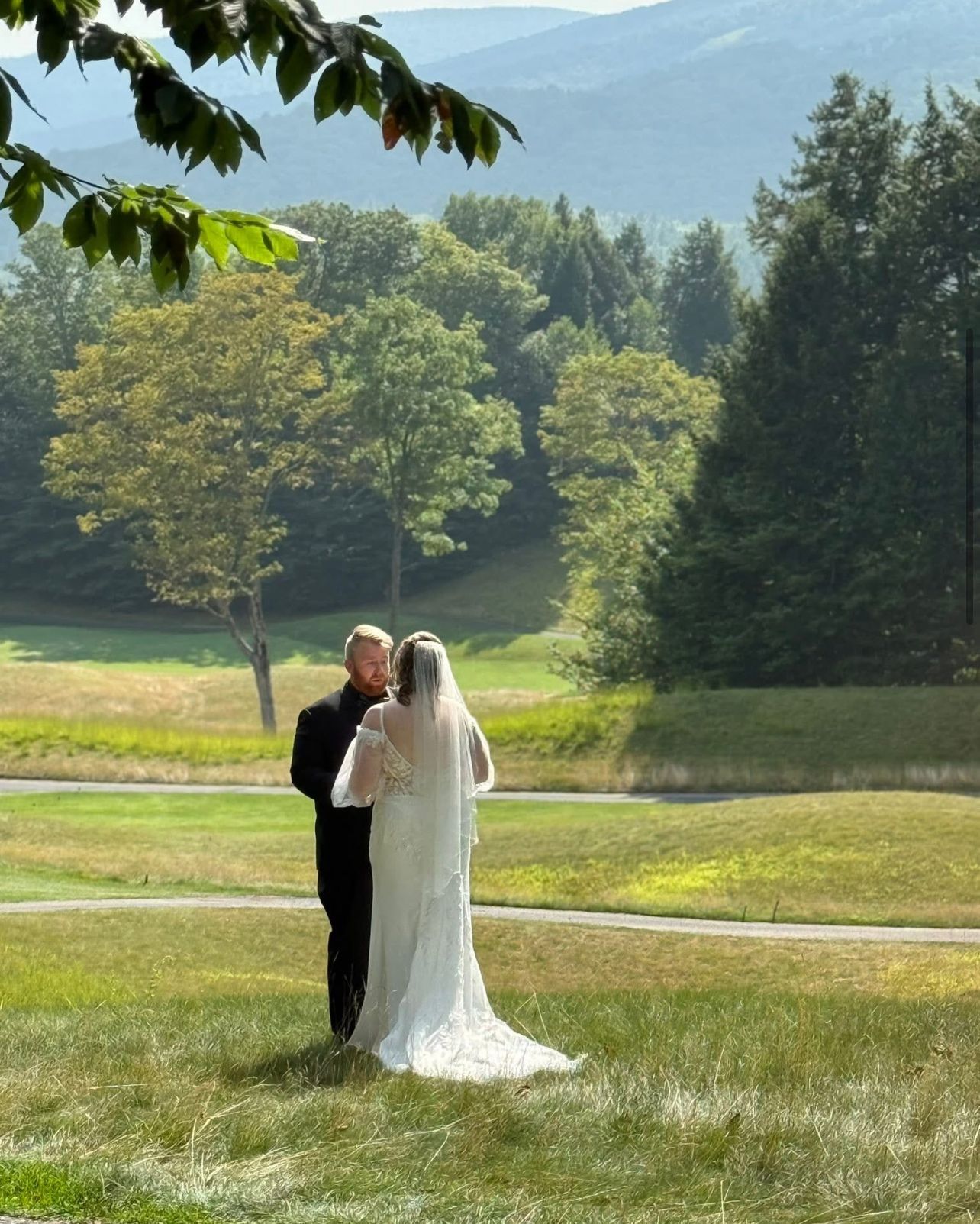 Groom hugs bride after wedding ceremony, white dress, black suit, officiant in background. Outdoor setting, green grass.