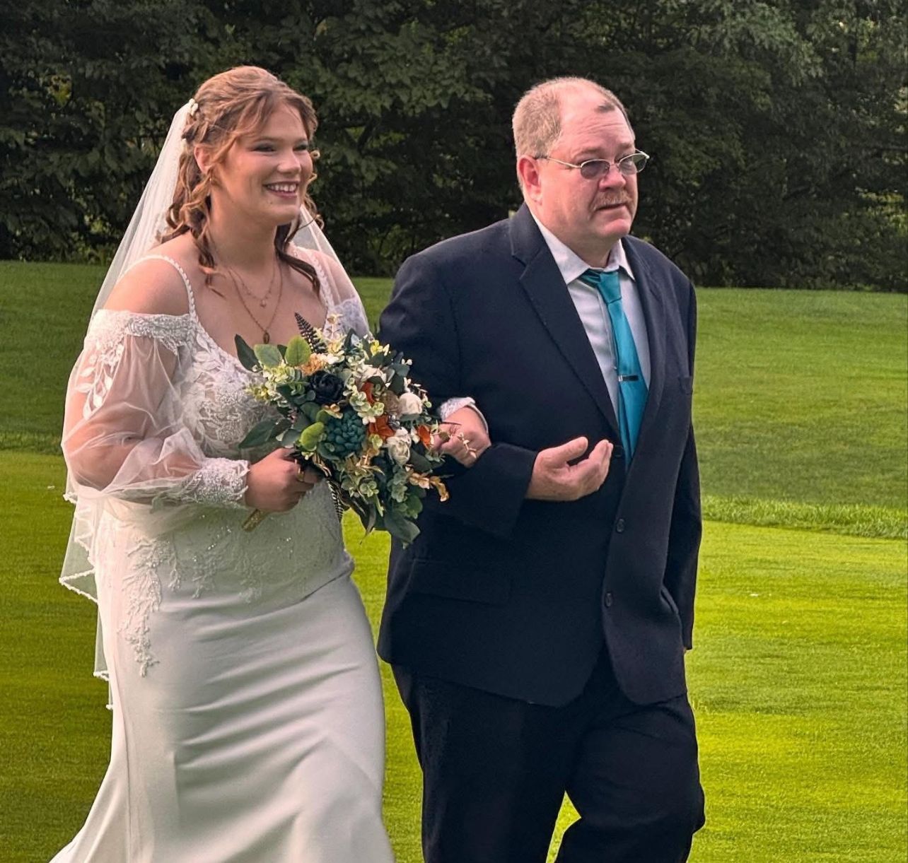 Father hugs bride at outdoor wedding, both smiling; guests watch.