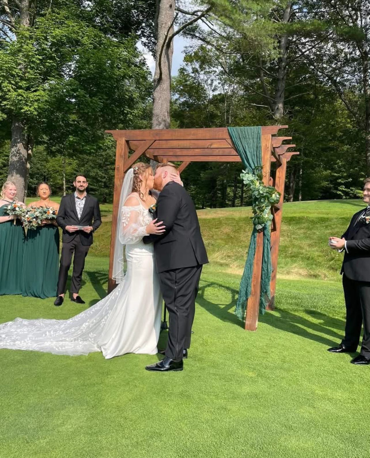 A bride and groom are kissing under a wooden arch at their wedding ceremony.